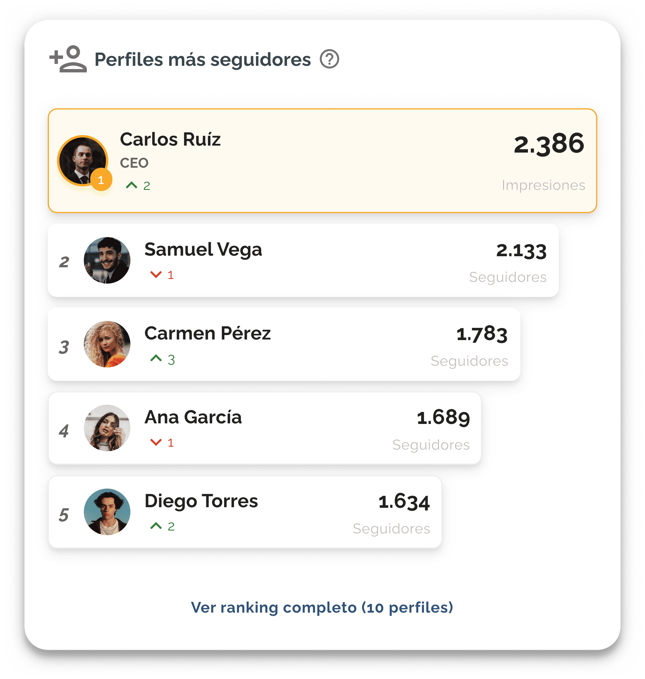 - Perfiles con mayor visibilidad: Identifica quiénes están liderando el alcance gracias a un mayor número de impresiones.