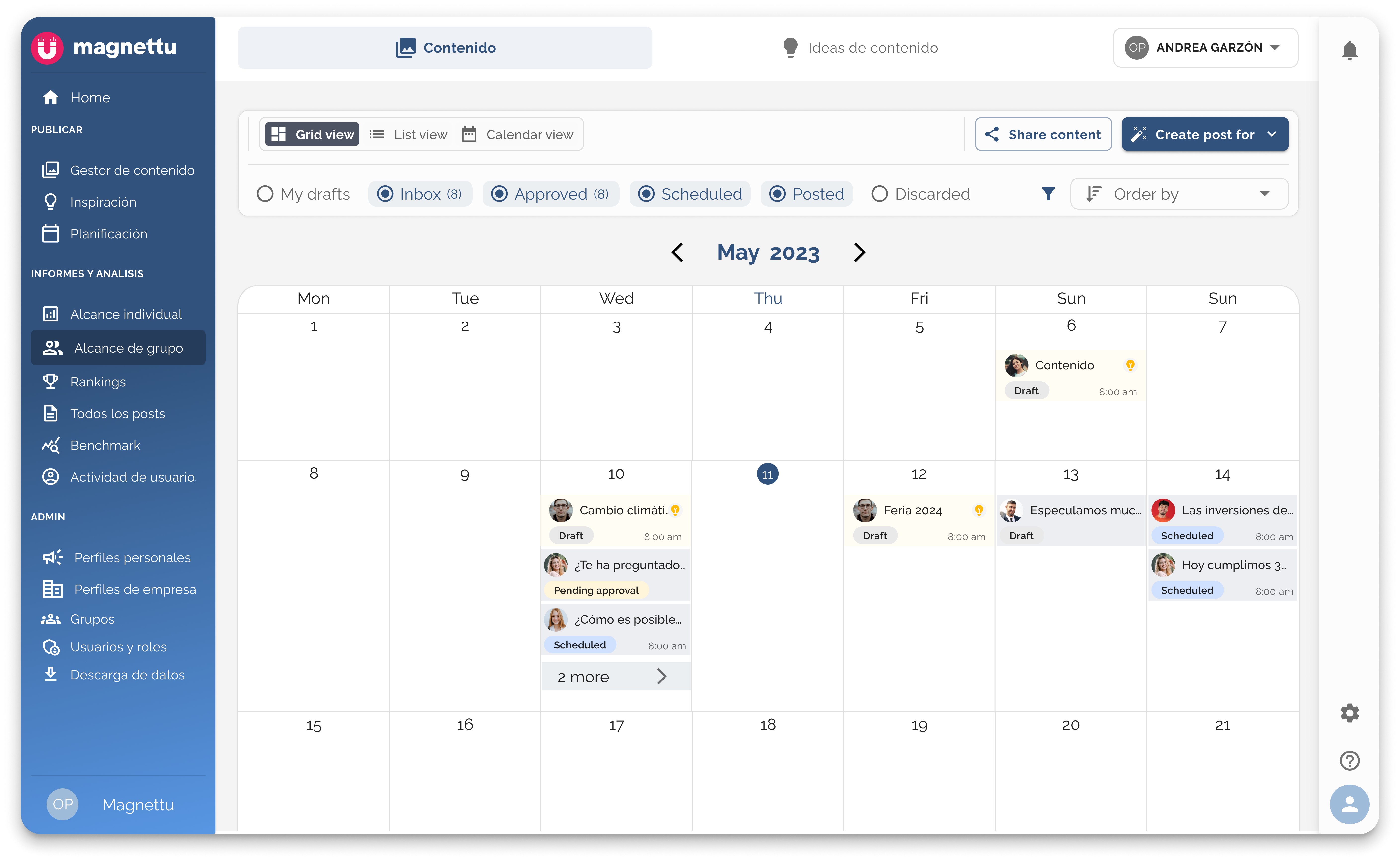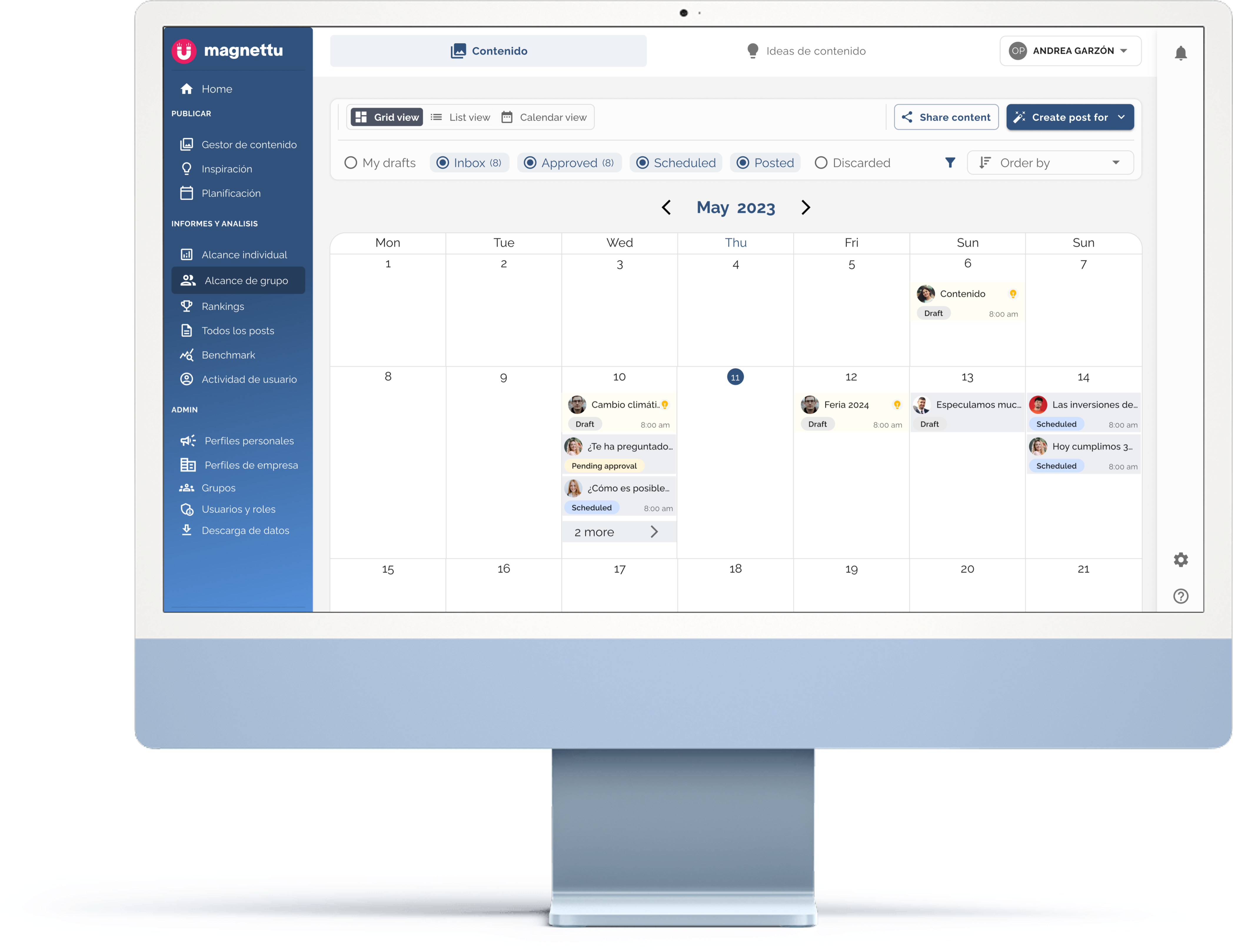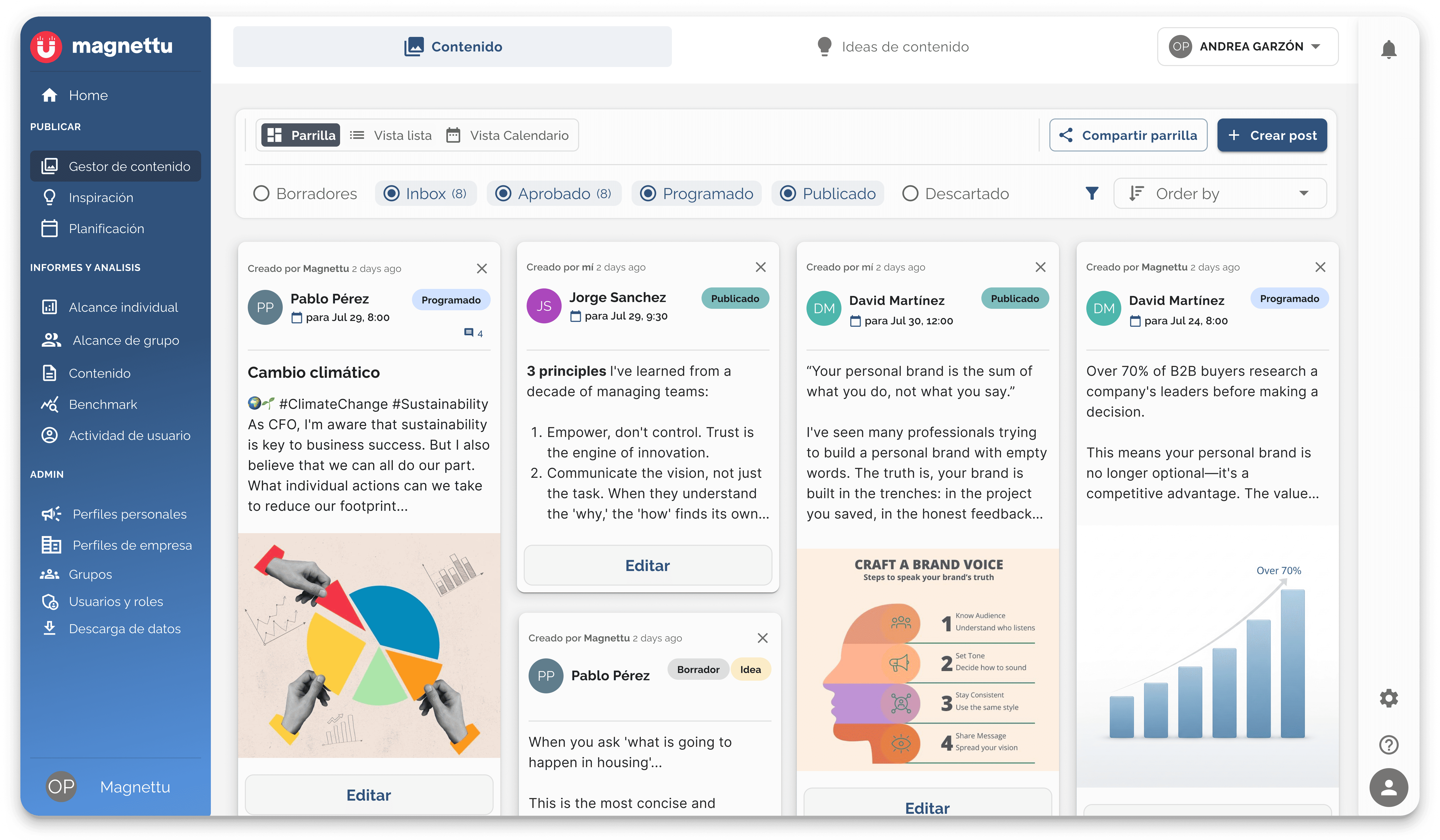 Gestiona diferentes marcas desde un único lugar y planifica tus estrategias de contenido con facilidad. Olvídate de planificar tu contenido Google Sheets o en Excel.